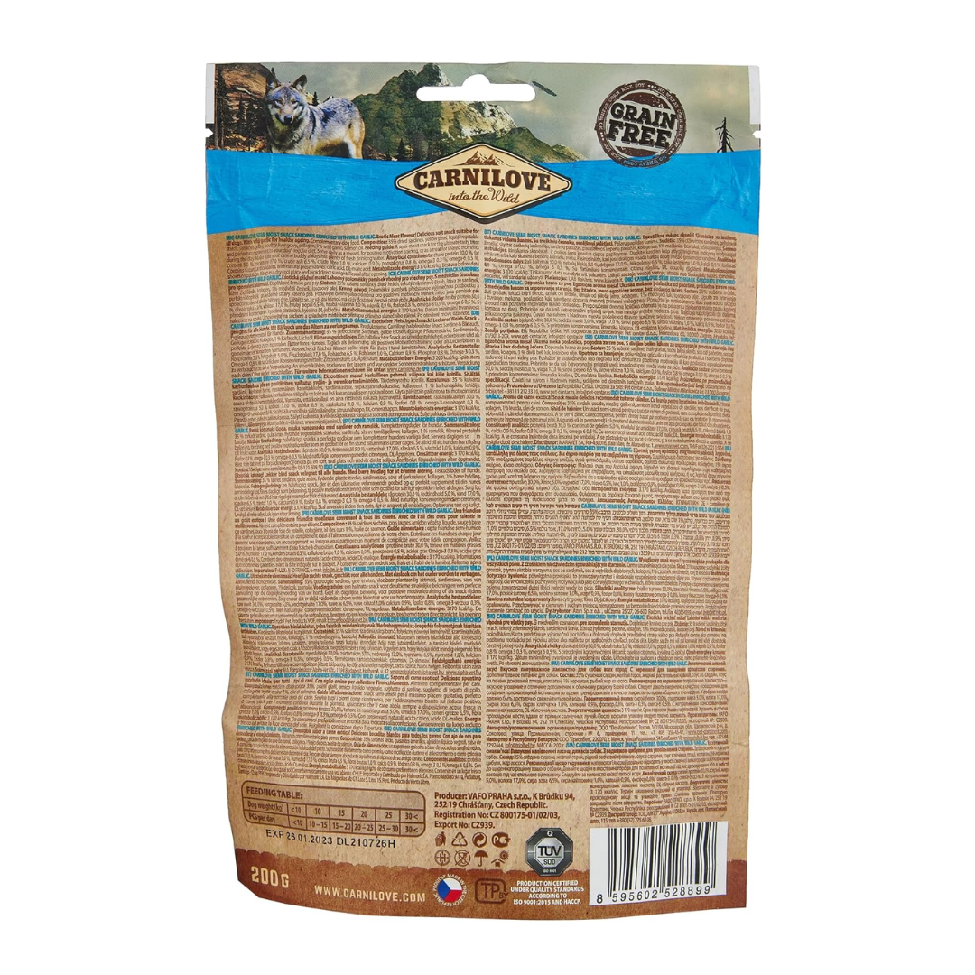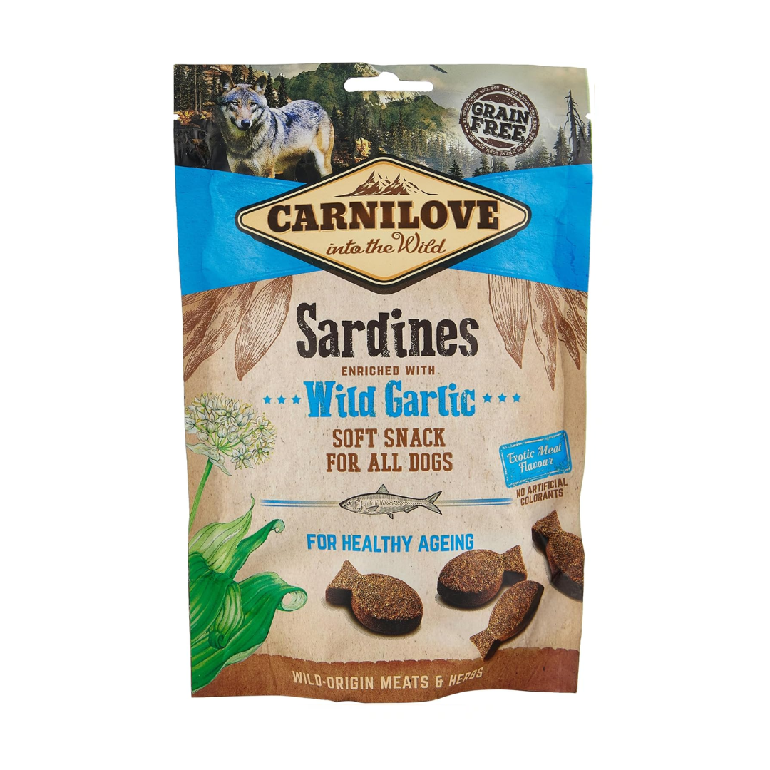 Carnilove Soft Snack Sardines and Wild Garlic treats are filled with natural and nutrient dense ingredients. Each bag has 35% Sardine, with tasty additions like sardine and poultry gravy - yum! Carnilove Semi Moist Snack Sardines enriched with Wild Garlic.