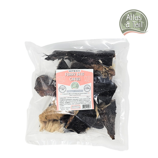 Atlas &Tail Furry Beef Chews are natural, long lasting chews that will fulfill your dog’s natural instinct to chew. Made from 100% beef skin with hair, they maintain all of the natural goodness and taste. These chews are thicker than other skin chews, which extends chewing time and also helps to promote your dogs oral health.