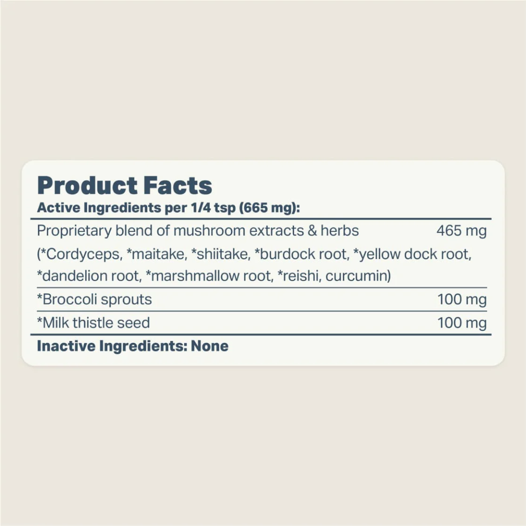 The active ingredients include; Milk Thistle Seed which contains the compound silymarin, which supports healthy liver and kidney function. Broccoli sprout powder is naturally rich in sulforaphane, which supports detoxification of heavy metals and toxins, reduces inflammation, and promotes digestive and heart health. There is also a blend of mushrooms extracts and herbs each with their own benefit to your dogs health.