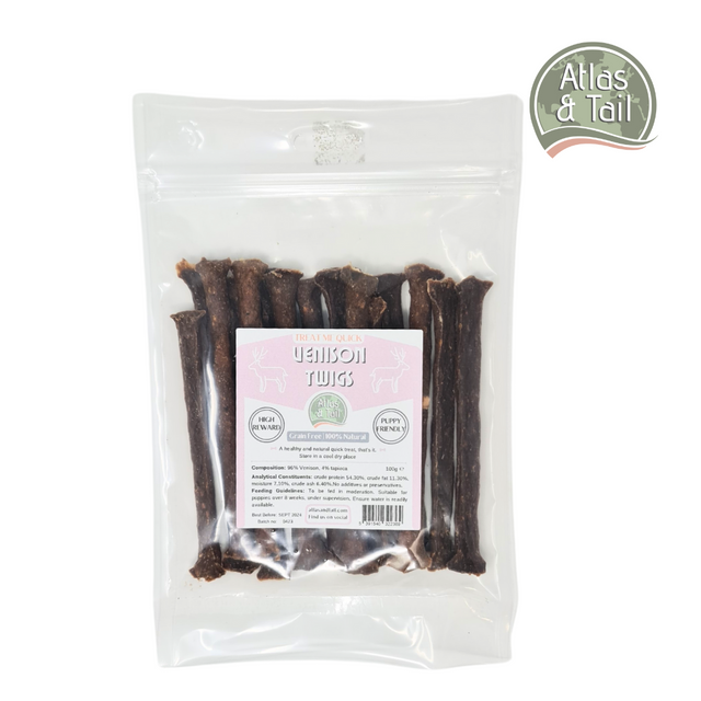 Atlas and Tail Venison Twigs are healthy and natural treats for dogs. Made from 96% venison meat, these treats are a massive hit with dogs. Use them as a snack or easily break them into smaller pieces to use them as a training reward.